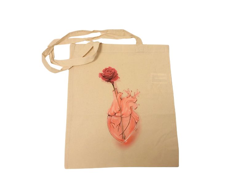 Esta bolsa de tela está personalizada con la ilustración digital Cor de vidre que Lourdes Ferreras, amiga, colaboradora de la entidad y mujer con cardiopatía congénita, creó para la imagen de Sant Jordi 2023 de la entidad.