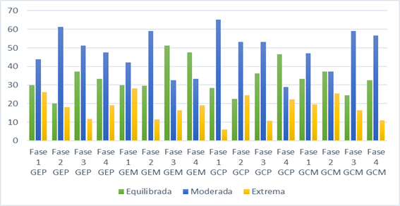 Porcentajes de las puntuaciones según la frecuencia de las tres tipologías de familias según lo HAGAS-III. GIBA: grupo experimental padres. GEM: grupo experimental madres. GCP: grupo control pares. GCM: grupo control madres