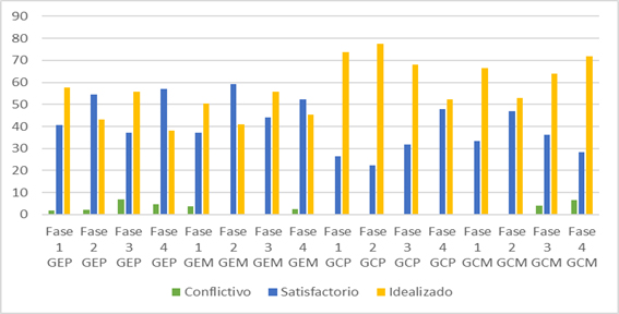 En el ajustamiento diádico encontramos padres y madres con una percepción idealizada de la relación de pareja que, con el paso del tiempo, tiende hacia una percepción satisfactoria. Hay que destacar que en la fase 2, la percepción satisfactoria es del 54,55% en los padres y del 59,09% en las madres; y la disminución de la percepción idealizada es del 43,18% en los padres y del 40,9% en las madres. En estos momentos de crisis que vive la pareja, se genera un impacto en la relación, produciendo una unión muy fuerte como padres (progenitores) y una desvinculación como pareja (cónyuges), donde la atención principal y preocupación pasa a ser el hijo/a enfermo. Aun así, hay que destacar que encontramos un 2,27% en padres donde la percepción es conflictiva con puntuaciones inferiores a 100 según las DAS (Escala de ajustamiento diádico).