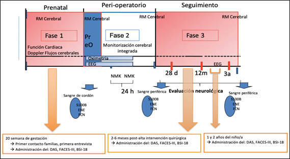 Fase 1: etapa prenatal | Fase 2: entre los 2 y 6 meses después de la intervención quirúrgica | Fase 3: 1 año de vida del niño | Fase 4: 2 años de vida del niño